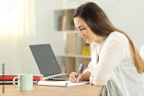 Student taking notes in a notebook on a table