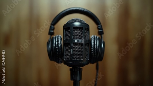 Studio Headphones & Microphone, Recording, Wooden Background, Close-up