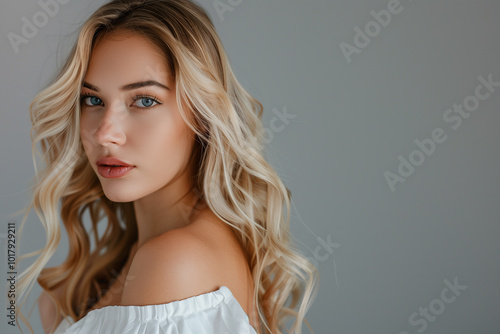 Studio portrait of curly hairstyle woman. Blonde fashion model with wavy long hairdo portrait. Volume, coiffure, cosmetic, hair care and hair treatment concept