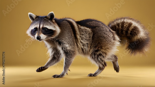 Studio shot of a raccoon standing on yellow background, side view