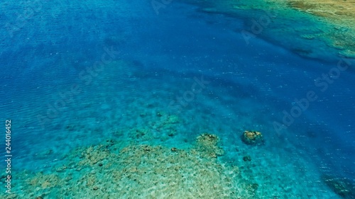 stunning aerial drone image of a great coral reef marine channel in calm weather flat water and incredible colorful sea ocean bed around a small remote isolated tropical island