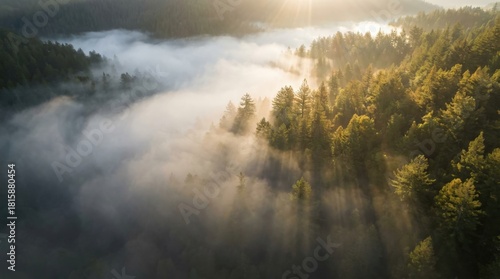 Stunning Aerial View of Misty Forest Landscape at Sunrise.