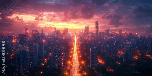 Stunning cityscape at sunset, featuring vibrant skies and illuminated streets, capturing the essence of urban life and evening tranquility.
