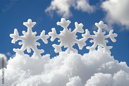 Stunning close-up of three intricate snowflakes perched atop a pristine snowdrift against a vibrant blue sky. Perfect for winter themes, holiday cards, or seasonal designs.