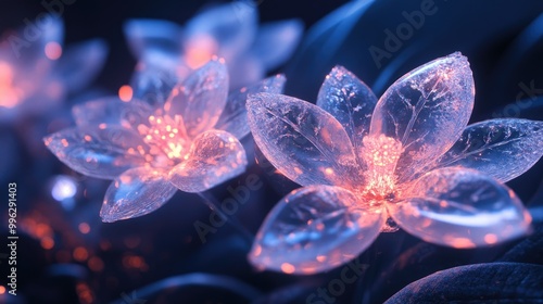 Stunning crystal flowers and leaves glowing under focused light, their intricate details brilliantly emphasized against a dark background