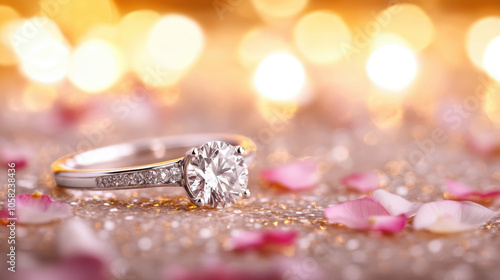 stunning diamond engagement ring on sparkling surface with rose petals, creating romantic atmosphere