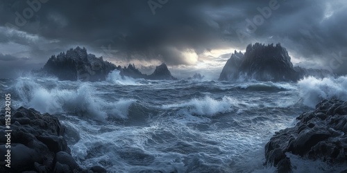 Stunning epic storm view of Cyclops Isles showcasing dramatic skies and rough waters. Experience the beauty of Cyclops Isles with black volcanic stones in this breathtaking perspective.