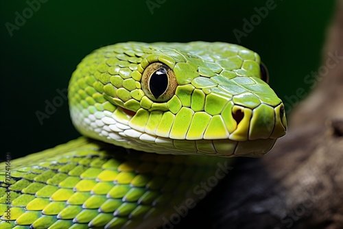 Stunning green snake on jungle tree branch macro close up of intricate reptile details