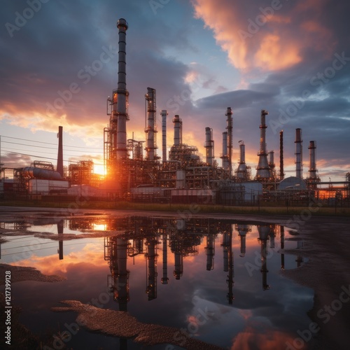 Stunning Industrial Landscape at Sunset with Dramatic Cloud and Reflection on Water, Showcasing Oil Refinery Structures and Atmospheric Beauty