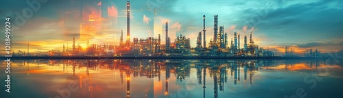 Stunning Industrial Refinery at Sunset with Vibrant Reflections on Water Creating a Dramatic and Colorful Skyline