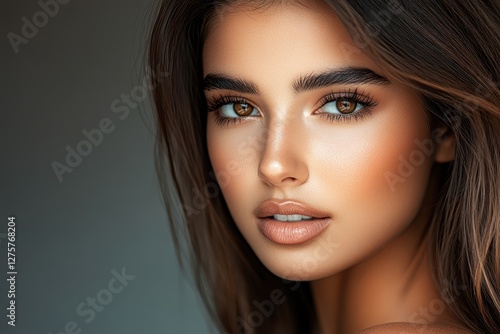Stunning Portrait of a Young Woman with Long Brown Hair and Natural Makeup