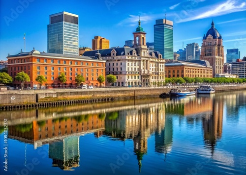 Stunning Product Photography of Darsena Sur with Ministry of Defense in Background, Showcasing the Beauty of Puerto Madero under a Clear Blue Sky, Buenos Aires, Argentina