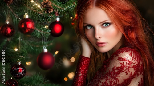Stunning Redhead Woman by Christmas Tree Festive Portrait