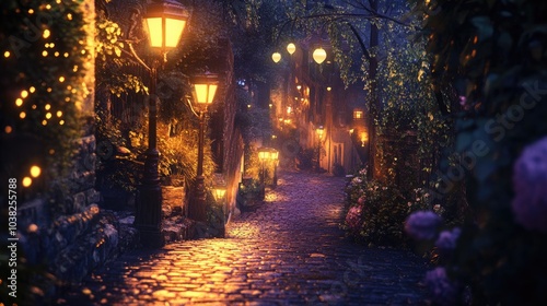 Stunning streetlights in rich hues lighting up a nighttime path, creating a magical and visually exciting experience