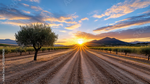 stunning sunrise over scenic olive farm with rows of trees