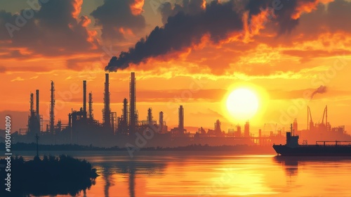 Stunning Sunset Over Industrial Landscape with Silhouetted Factories and Reflective Waters A Perfect Harmony of Nature and Industry