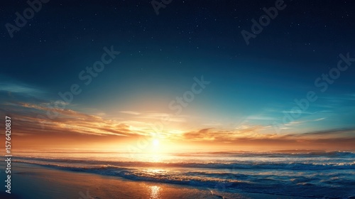 Stunning sunset over ocean horizon with vibrant sky and reflective water scene.