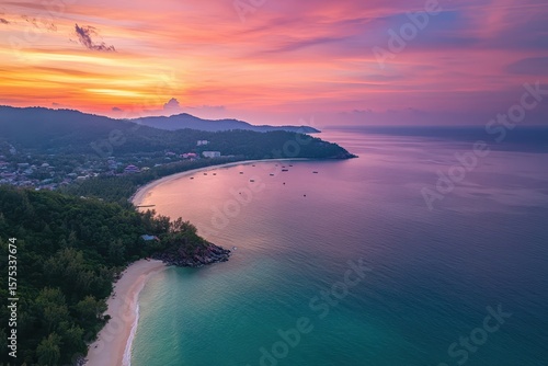 Stunning sunset over Tri Trang beach, Phuket Island showcasing vibrant colors and serene ocean waves, Phuket island sunset seascape aerial view Tri Trang beach Patong bay Thailand