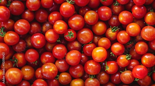 Stunning Top View of Vibrant Red Cherry Tomatoes Piled High, Exuding Freshness and Healthiness for a Nutritious Diet. A Real Photo Capturing the Essence of Healthy Eating.