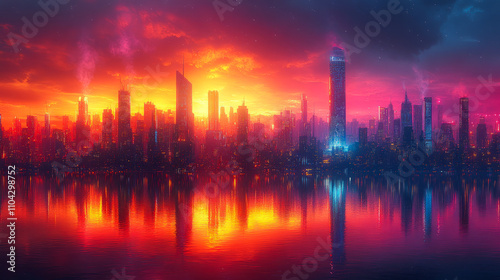 Stunning urban sunset over reflective cityscape with vibrant skyscrapers