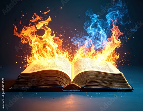 Stunning visual of an ancient book engulfed in flames and smoke creating a dramatic scene symbolizing knowledge and destruction