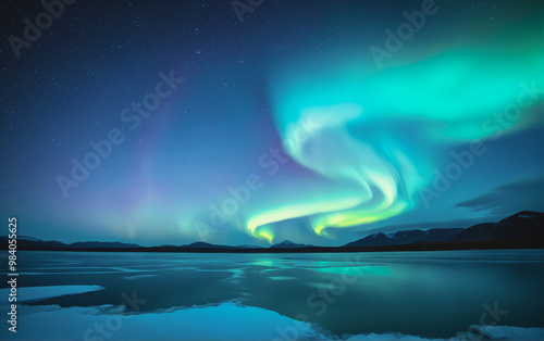 Stunning winter landscape: the night sky with the northern lights reflected in the water of a mountain lake. Night winter landscape with aurora. Borealis.
