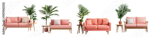 Stylish and modern living room with pink sofas and tropical plants.