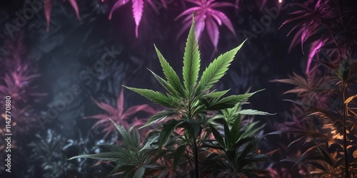 Stylish cannabis backdrop with neon glowing leaves, marijuana, backdrop, cannabis, neon