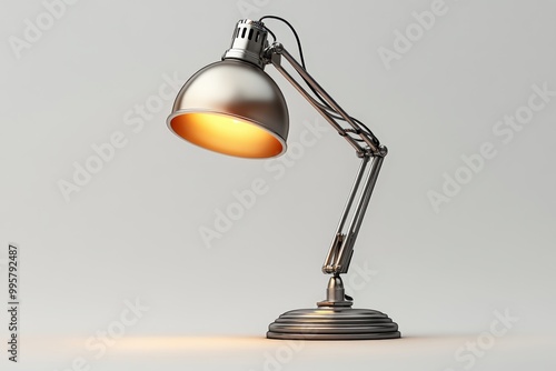 Stylish desk lamp providing warm light, isolated on white background.