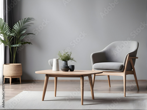 Stylish grey wooden chair in empty living room interior with trendy wooden coffee table. Front view.