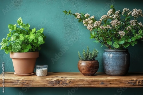stylish kitchen room featuring green wall paneling and a wooden shelf, evoking a fresh, modern, and eco-friendly design aesthetic