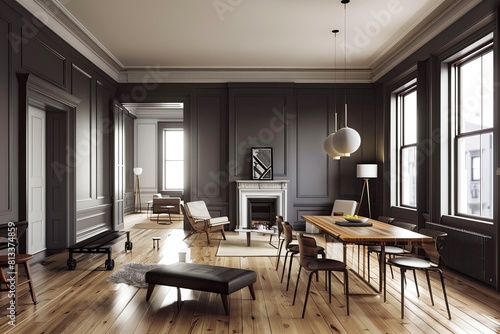 Stylish living room interior of modern apartment and trendy furniture, plants and elegant accessories. Home decor. Template, 3D render, 3D illustration.
