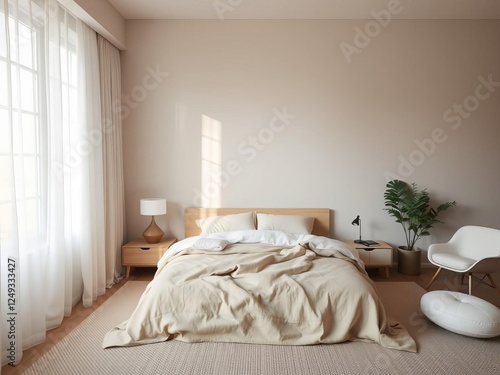 Stylish modern bed with clean lines and neutral tones in a minimalistic bedroom setting, tranquil, comfortable, room