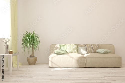 Stylish room in white color with sofa. Scandinavian interior design. 3D illustration