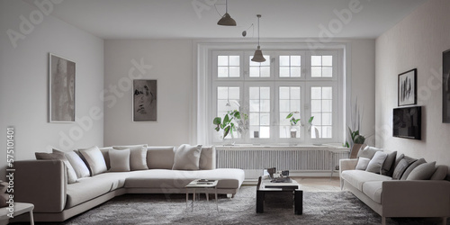 Stylish scandinavian living room with design mint sofa, furnitures, mock up poster map, plants and elegant personal accessories. Modern home decor. Bright and sunny room. Generative AI illustration.