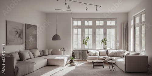 Stylish scandinavian living room with design mint sofa, furnitures, mock up poster map, plants and elegant personal accessories. Modern home decor. Bright and sunny room. Generative AI illustration.