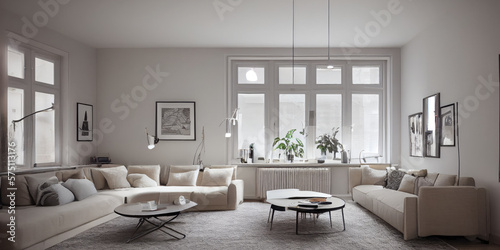 Stylish scandinavian living room with design mint sofa, furnitures, mock up poster map, plants and elegant personal accessories. Modern home decor. Bright and sunny room. Generative AI illustration.