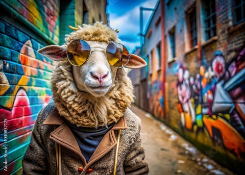 Stylish Sheep in Urban Setting with Sunglasses and Coat for Unique Exploration Photography