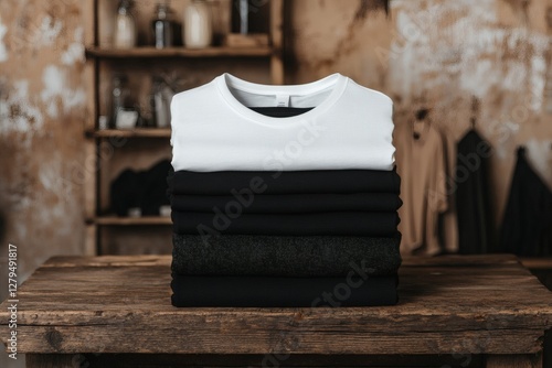 Stylish stack of minimalist clothing in a rustic shop setting. Generative AI