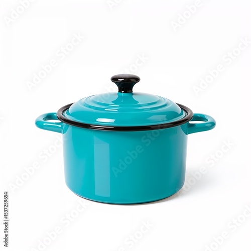 Stylish turquoise cooking pot with black lid on white background
