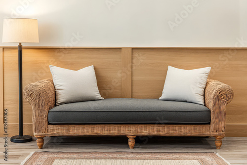 Stylish wicker sofa with gray cushion and decorative pillows in cozy living room setting