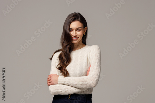Stylish young girl with long hair and glowing skin posing on gray background. The concept of business, femininity.