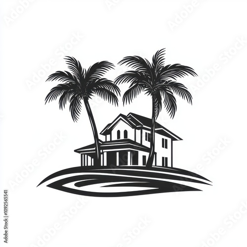 Stylized black and white illustration of a house surrounded by palm trees, evoking a tropical vibe.
