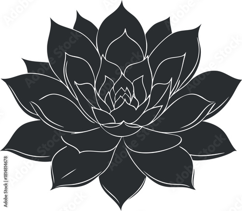 Stylized black and white vector illustration of a lotus flower, ideal for wellness, spa, and nature-themed designs