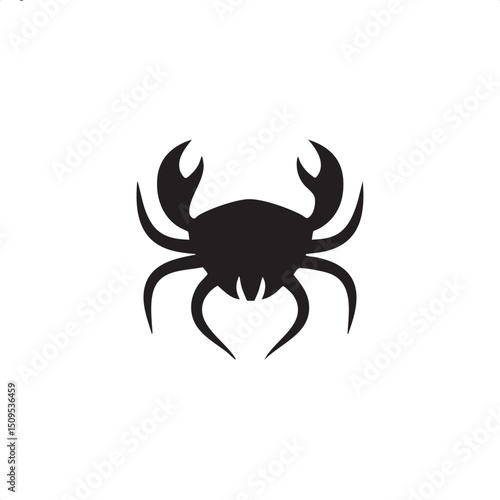 stylized black crab silhouette stands against a white background.