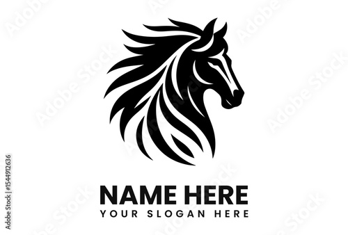 Stylized black horse head logo design, elegant mane, profile view, placeholder text.