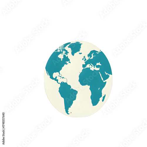 Stylized flat illustration of the planet Earth globe with teal continents, isolated on a white background. A symbol of global connection, travel, and environmental awareness