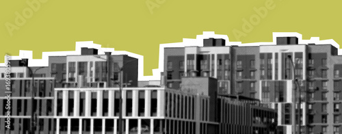 Stylized graphic representation of modern residential complex with black and white multistorey