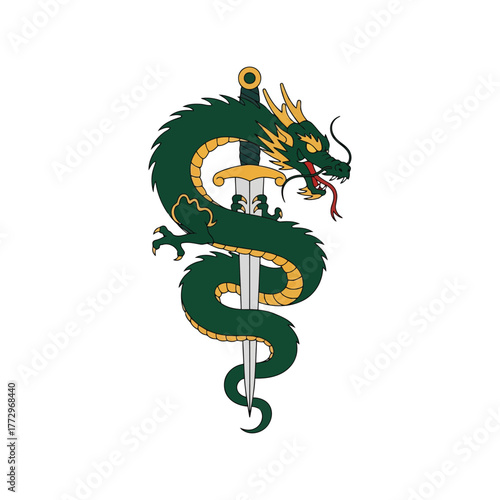 Stylized green dragon coiled around a silver sword on a white background Vector, illustration