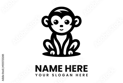 Stylized monkey illustration in black and white, seated with a friendly expression, above placeholder text.